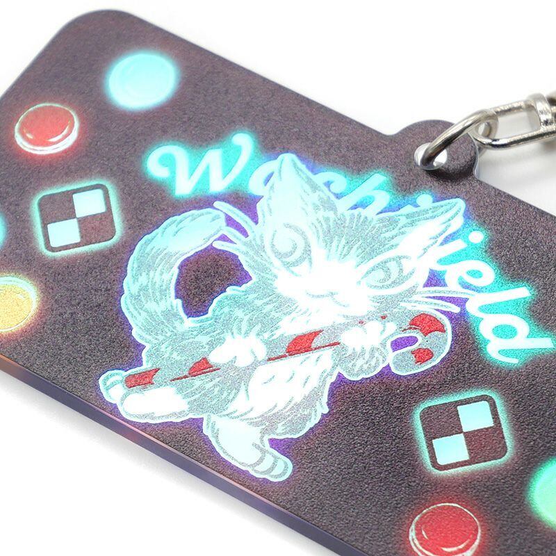 ネオンサイン風にきらめくアクリルキーホルダー。角度によって様々な色を見せてくれます。