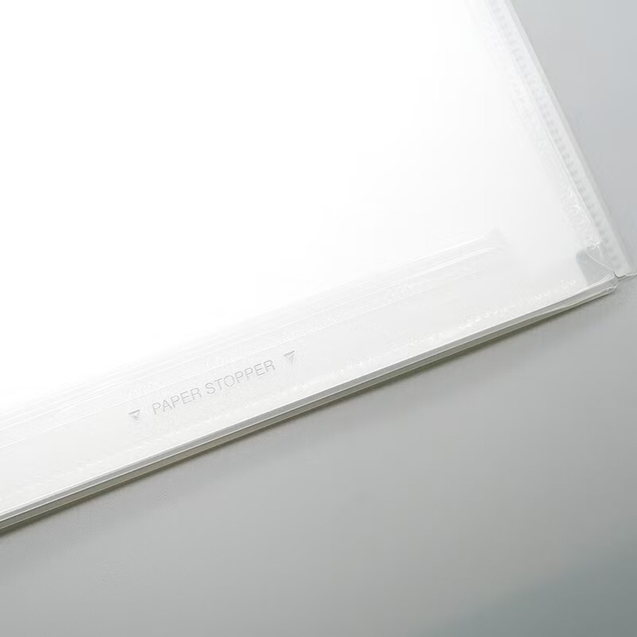 書類の分類に便利なインデックス付きホルダー。通常のクリアファイルの約3倍の厚みがある丈夫なシートを採用しているので、カバンの中でぐにゃりと曲がりません。マチ付きで、A4クリアファイルもぴったり収納できます。A4コピー用紙は約100枚収納可。裏面にはペーパーストッパー付きなので、机の無い所では下敷きボードに早変わりします。