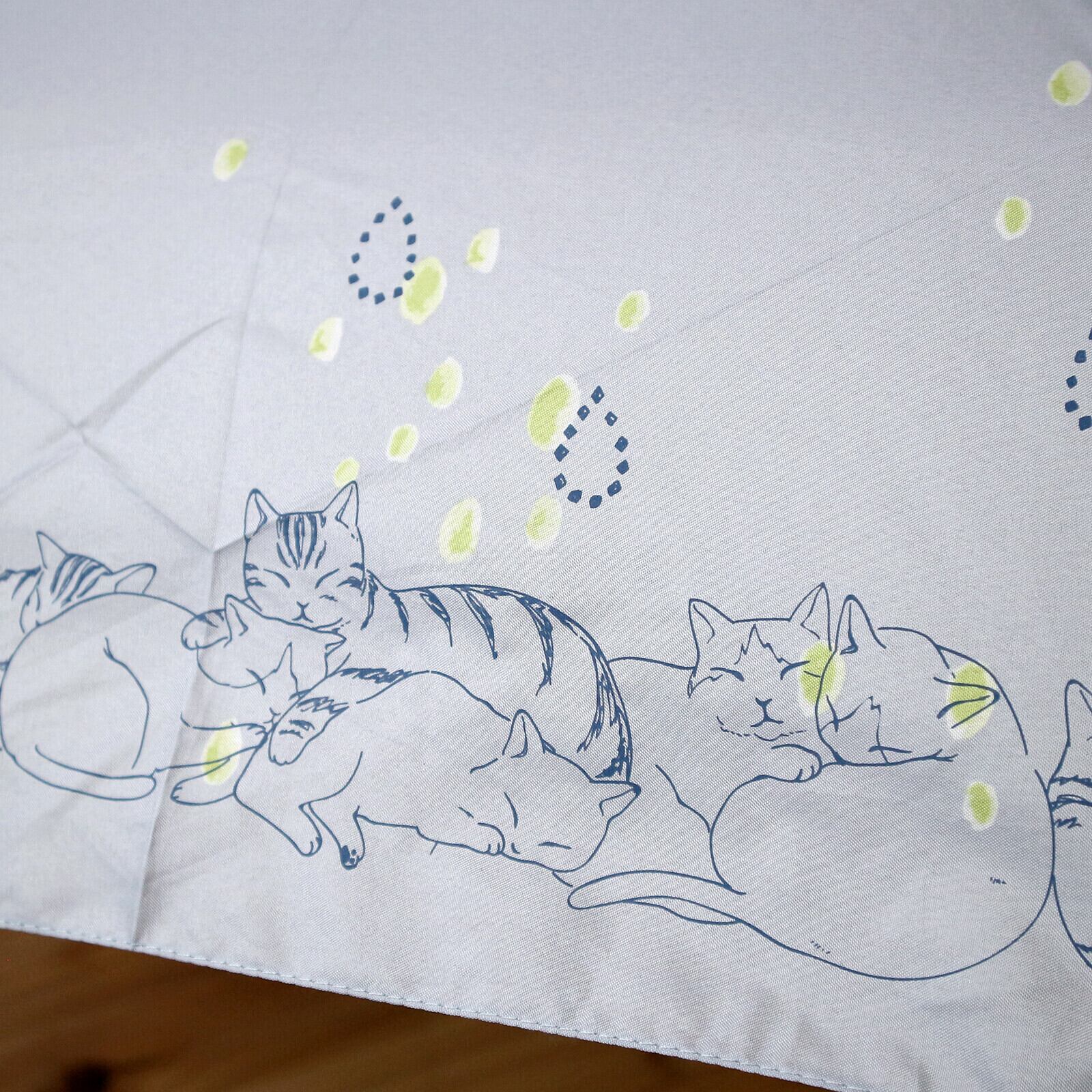 淡い水彩風のペイントドットプリントに、まったりなおやすみ中の猫達が裾にシルクプリントされています。
