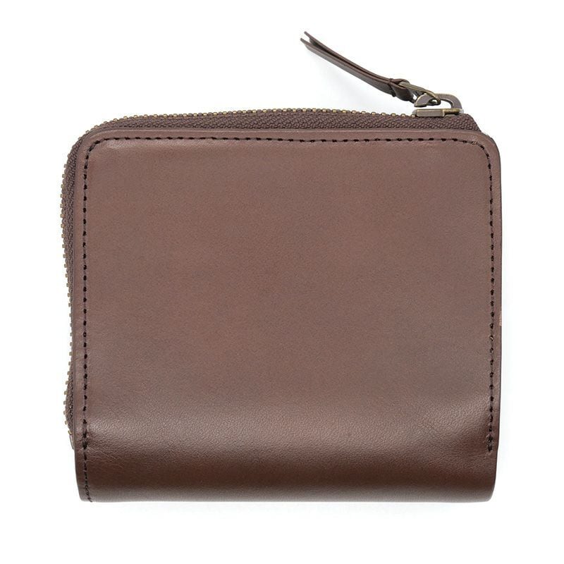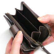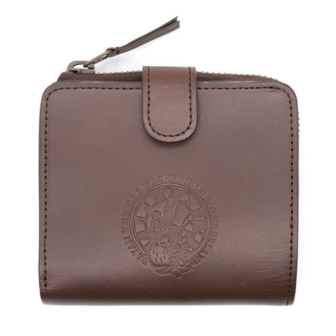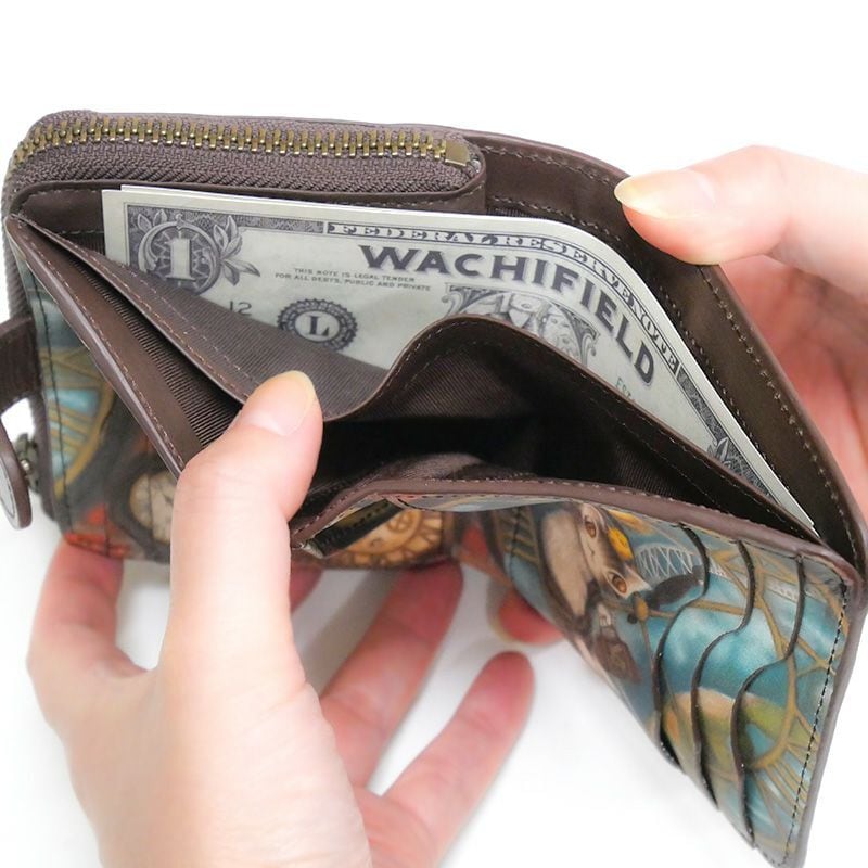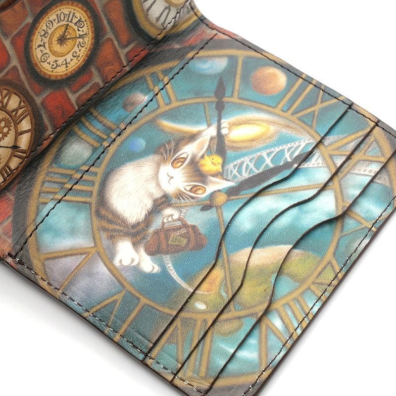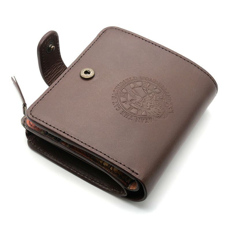 表側のデザインはこげ茶の牛革に型押しでマークを入れたのみのシックなシンプル仕様。中を開くと色鮮やかな「逆さま大時計」柄がぱっと広がる、内側アートを楽しむコンパクトな二つ折り財布です。