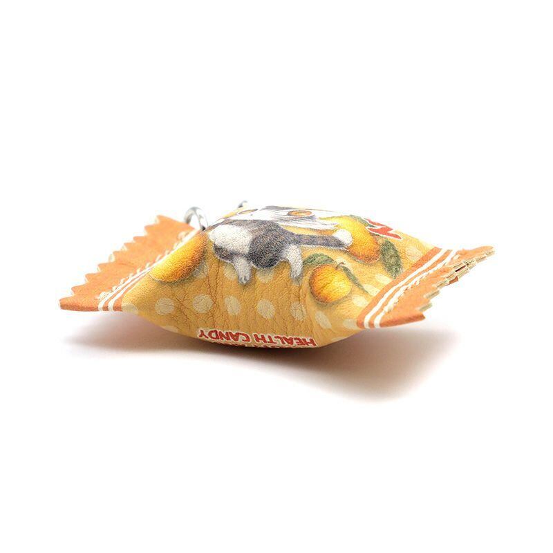 個包装のキャンディをイメージした革小物。ファスナー引手としてもストラップとしても使えるアイテムです。中にスポンジを入れてぷっくりと立体的に仕上げました。
